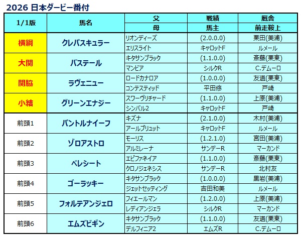 2026 クラシック番付 牡馬編(1/1時点)