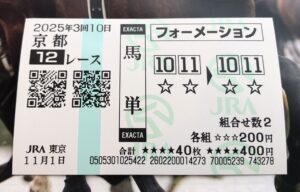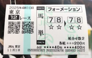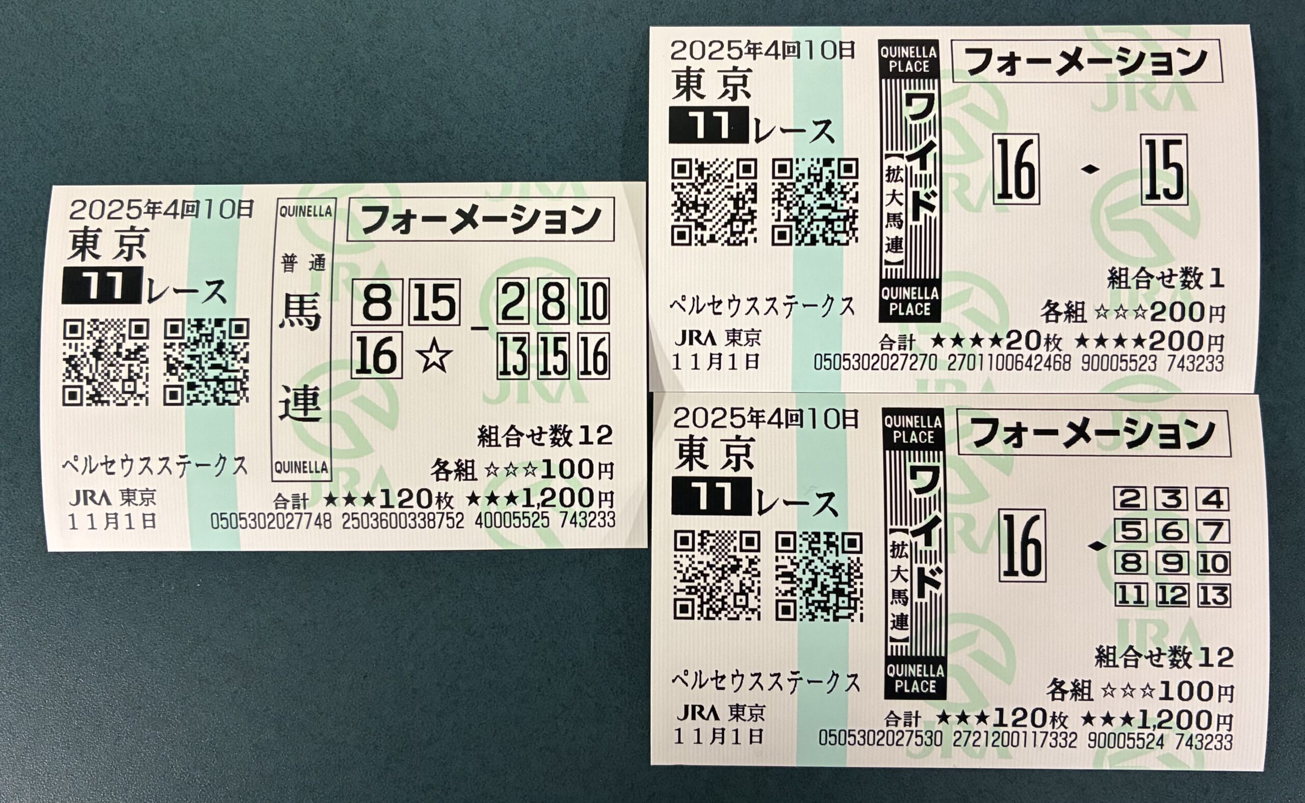 大混戦の粒揃いメンバーの印象、それでも東京マイルなら、新馬戦から追いかけて来た父アロゲート ⑯アッシュルバニパル が強いと思います。連続して東京2100使ったのが謎、1度惨敗したら、もう使わないと思ったのにまた使うし。道悪で時計持ってて、得意のワンターンに戻せば軸としては信頼できると思います。WIN4は1通りにします。あとは、ダート2度目 ⑮トロヴァトーレ + 初ダート3頭 ⑦カラマティアノス、⑧ジェイパームス、⑩レガーロデルシエロ が化けて来るかな。ジェイパームスは毎日王冠でも狙ってたくらいで、スピードの絶対値は重賞級です、あとダート適性だけ。雨で軽くなった馬場が味方すれば。この子たちに走られたら仕方ないです。馬券は馬連ワイドで勝負、買ったら下に載せます。