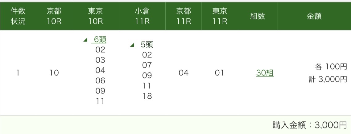 先週のWIN5の話。5億円キャリーオーバーも売上62億円の過去最高じゃ的中しても1割増にもならず。1つ目はグランドプラージュ1通り、2つ目、3つ目は上位人気の頭で買えそうな子をピックアップ、4つ目はエリキング届かず、前残りのドボンと読んで展開までは読み通り。引退のバビットの番手取るだろうと読んで、エコロディノスの方にしちゃったわ。更に前にいたジューンテイクに分がアリでしたね、バビットが思いの外、前で飛ばせなかったのが誤算です。あと1頭、いや2頭足して、90通りの買い目にしてたら4つ目も的中してたけど…
