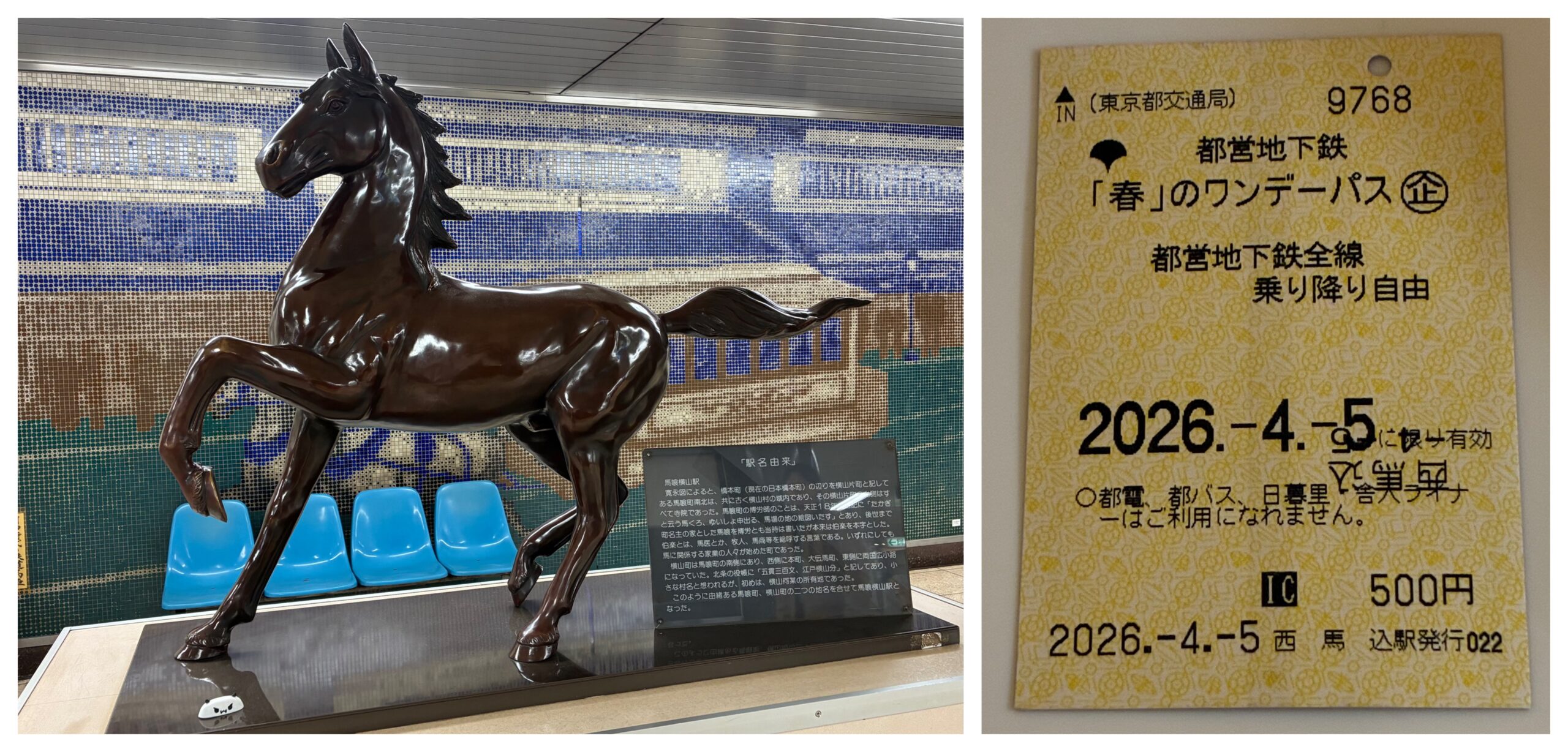 で、先週は都営線ワンデーパスが使えたので、JR東日本の値上がりを受けて、本八幡経由の東中山から行ってきました。期間限定のワンコインワンデーパス500円🪙上は馬喰横山駅の馬🐎 多摩川を越えて西馬込駅まではバス定期があり、西馬込から浅草線に乗って東日本橋(馬喰横山)で新宿線に乗り換え本八幡へ、京成八幡↔︎東中山146円×2なので、往復してもJRの片道より安いです。新宿の掛かり付け医にも寄ってこれるし、浅草、日本橋、銀座、新橋、築地とカバーしてるでついでの使い道は沢山、本当にありがたいわ。期間限定じゃなくて通年にして欲しいですね。