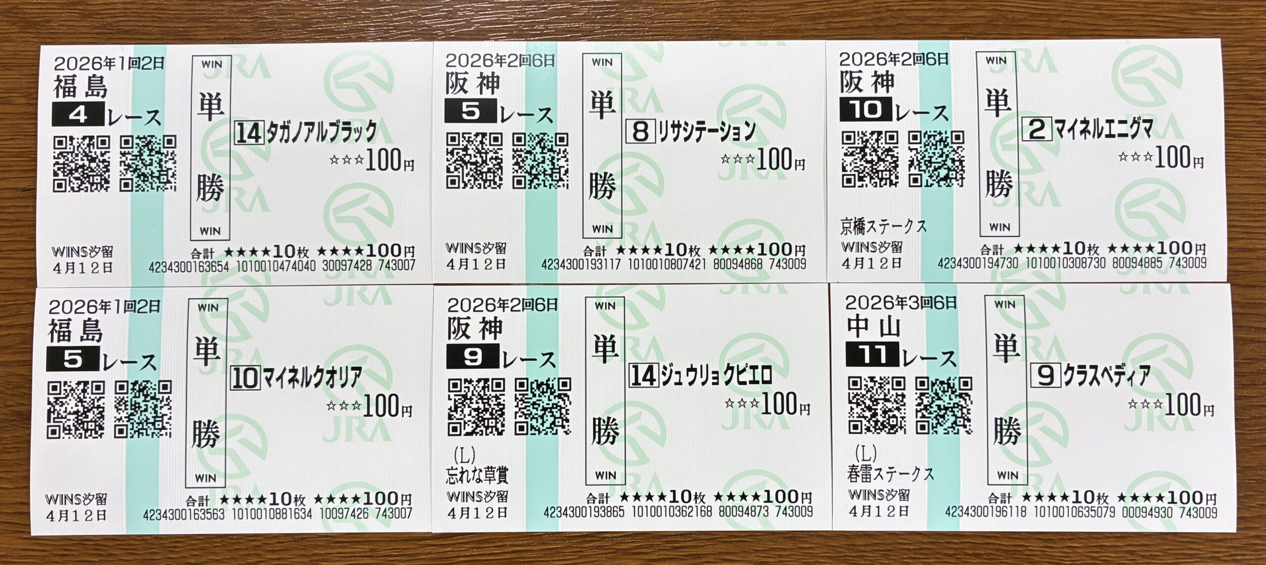 忘れな草賞はダーリングハーストが残念だった分、ジュウリョクピエロの単勝で稼げたし、最後の現役グラスワンダー産駒のマイネルエニグマは勝ってくれて嬉しいわ。これからコピー、換金して、皐月賞の軍資金にしたいと思います。あ、今日は中山、明日は指定席ないので自宅です。
